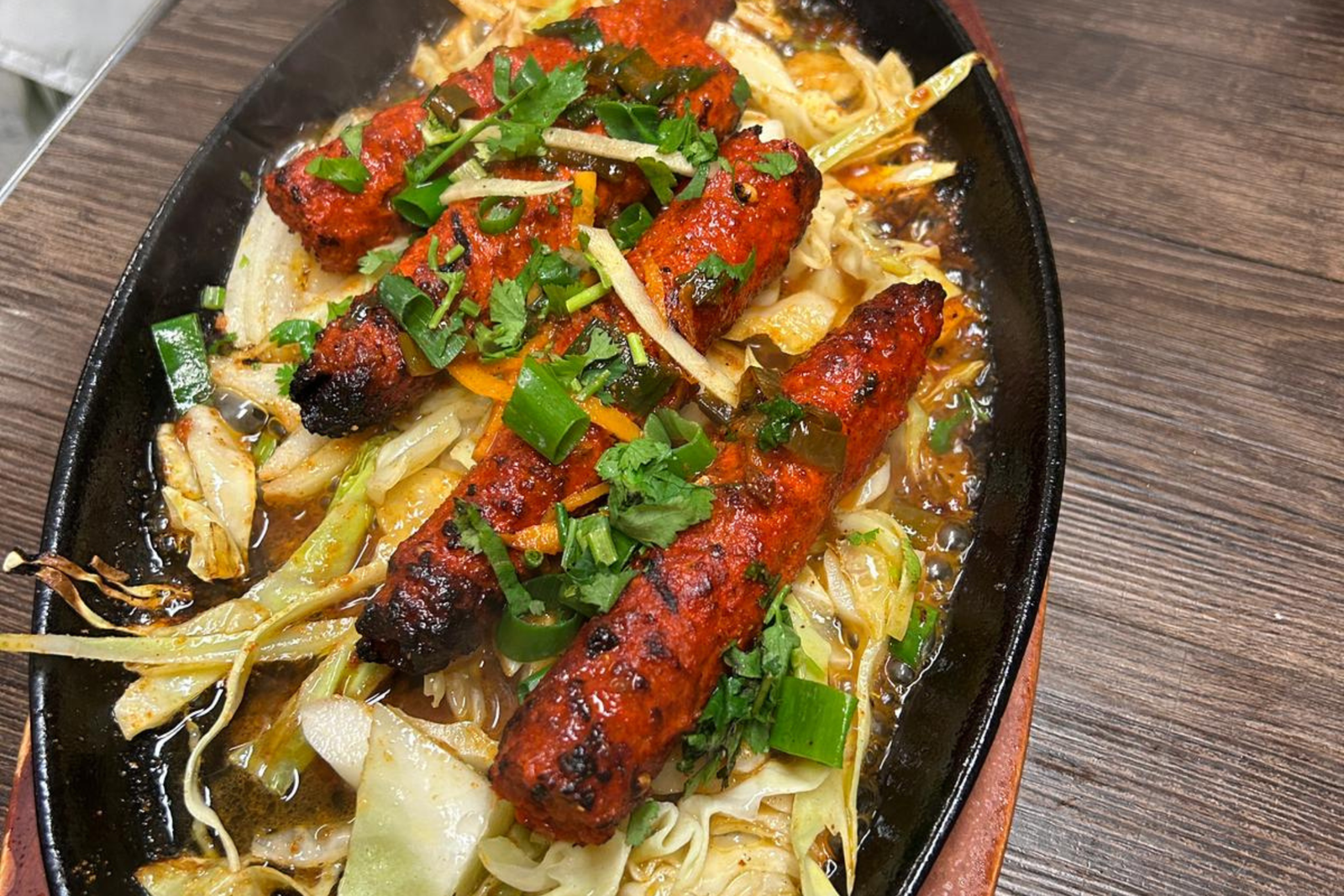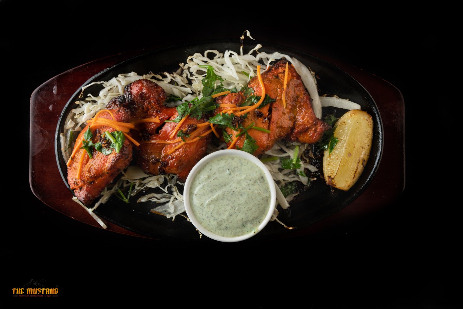 Boneless chicken thigh fillets marinated with Himalayan spices, cooked in tandoori oven and served on sizzler with sliced onions, cabbage, and mint &yoghurt sauce.