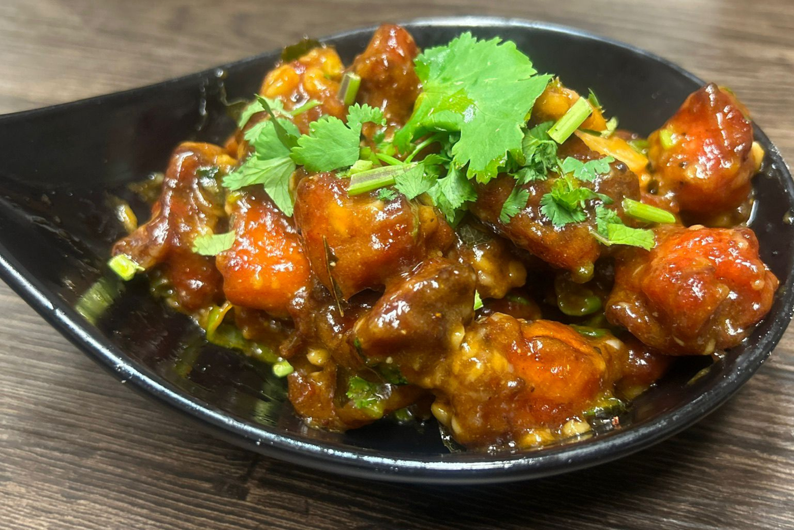 Diced paneer marinated with Himalayan herbs, deep-fried until crisp and sautéed with onions, capsicum, ginger, garlic, soy and tomato sauce.