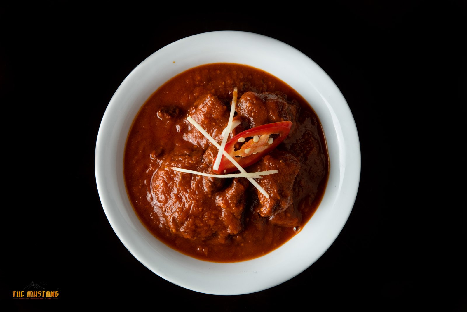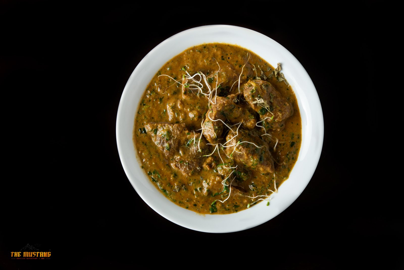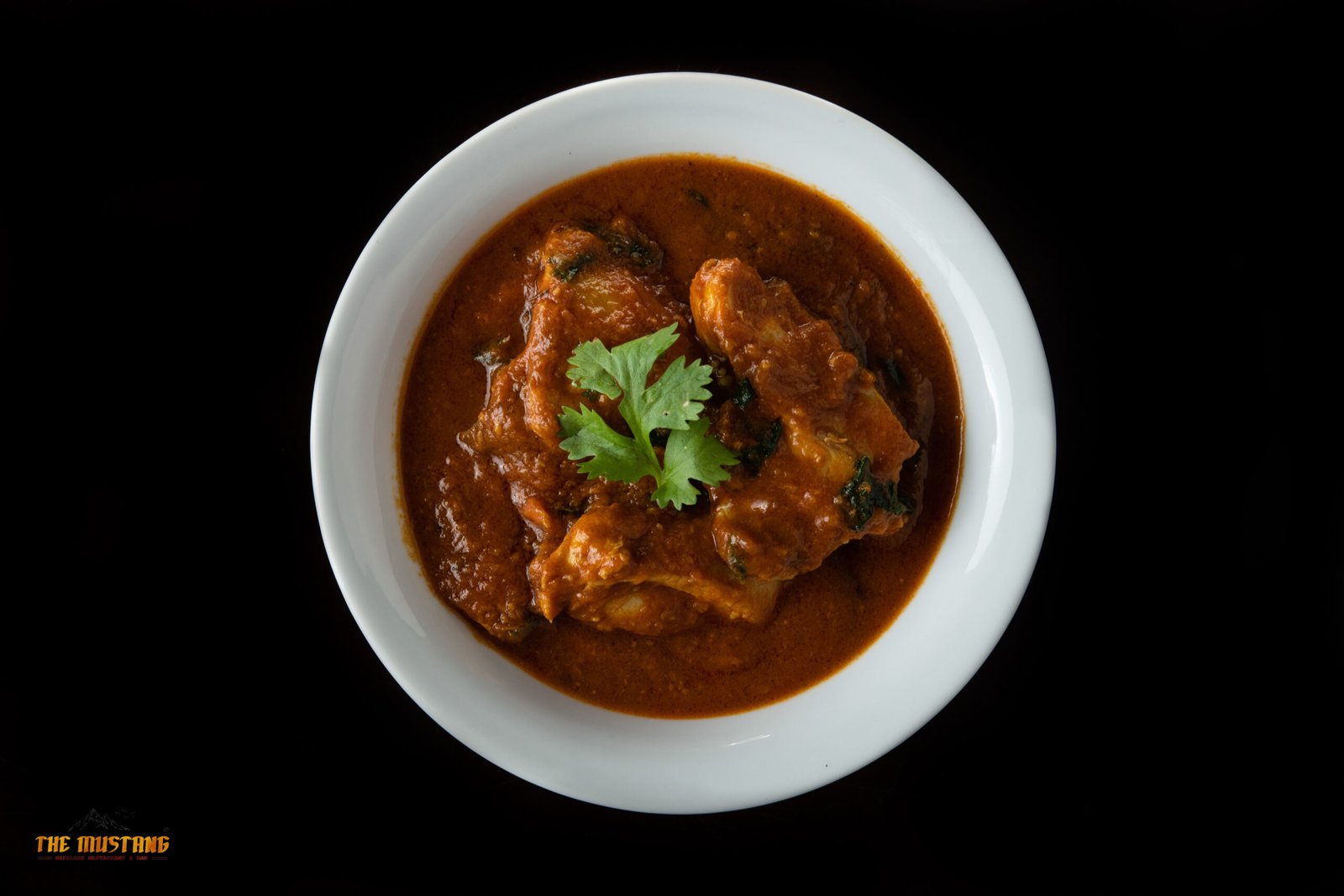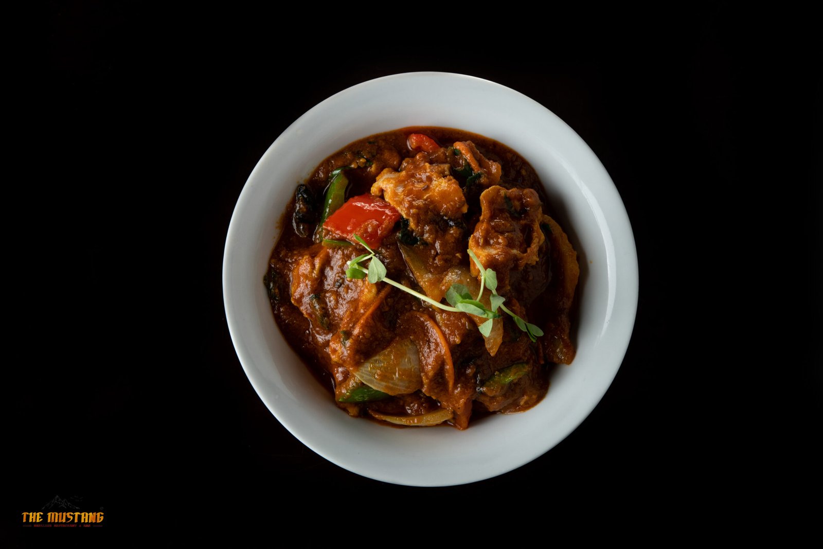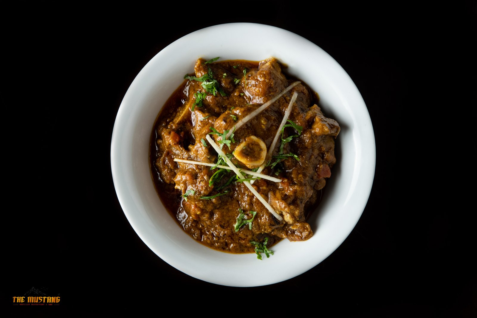 A traditional style preparation of goat meat on the bone cooked in Nepalese style curry.