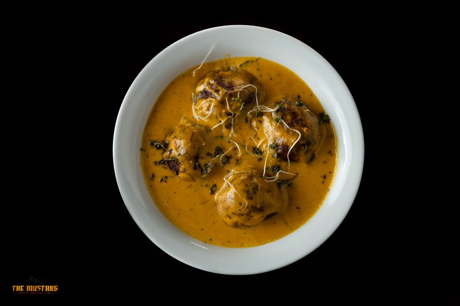 Fried mashed potatoes, cottage cheese and dry fruit balls dunked in mild,