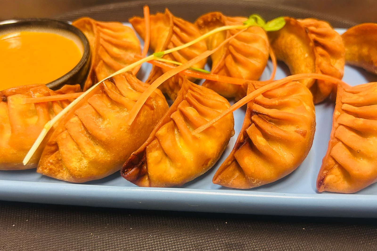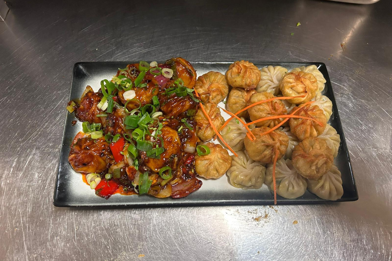 An assortment of 10 steamed, 10 fried, 10 chili mo:mo: served with traditional